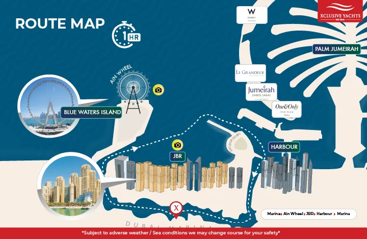 Depending on the duration of your booking, our typical cruising routes cover popular Dubai landmarks, including JBR, Atlantis, and Burj Al Arab. The route can be customized based on your preferences and the number of hours you’ve booked, allowing you to explore some of the city’s most famous sights from the water.