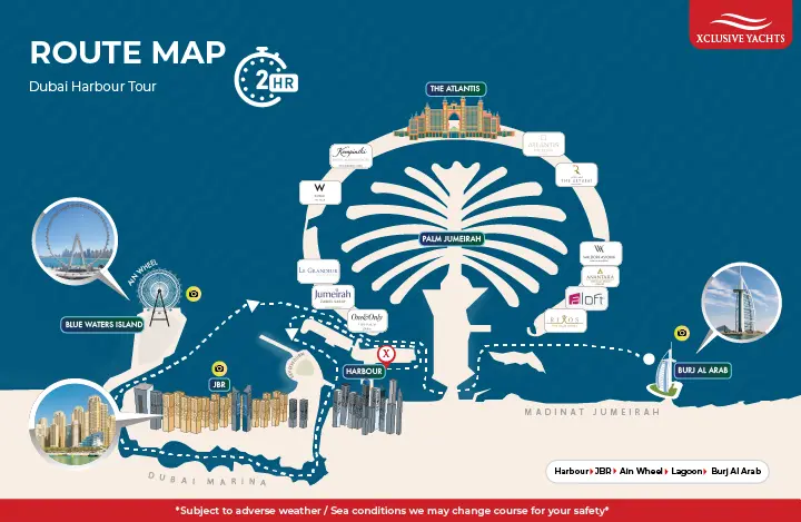 Boarding takes place at Dubai Harbour, at Xclusive Yachts – Gate 19 – FA‐FB