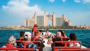 The speed boat Dubai tour offers a thrilling ride with views of Dubai's famous landmarks like the Marina Skyline, Ain Wheel, Atlantis, and Burj Al Arab.