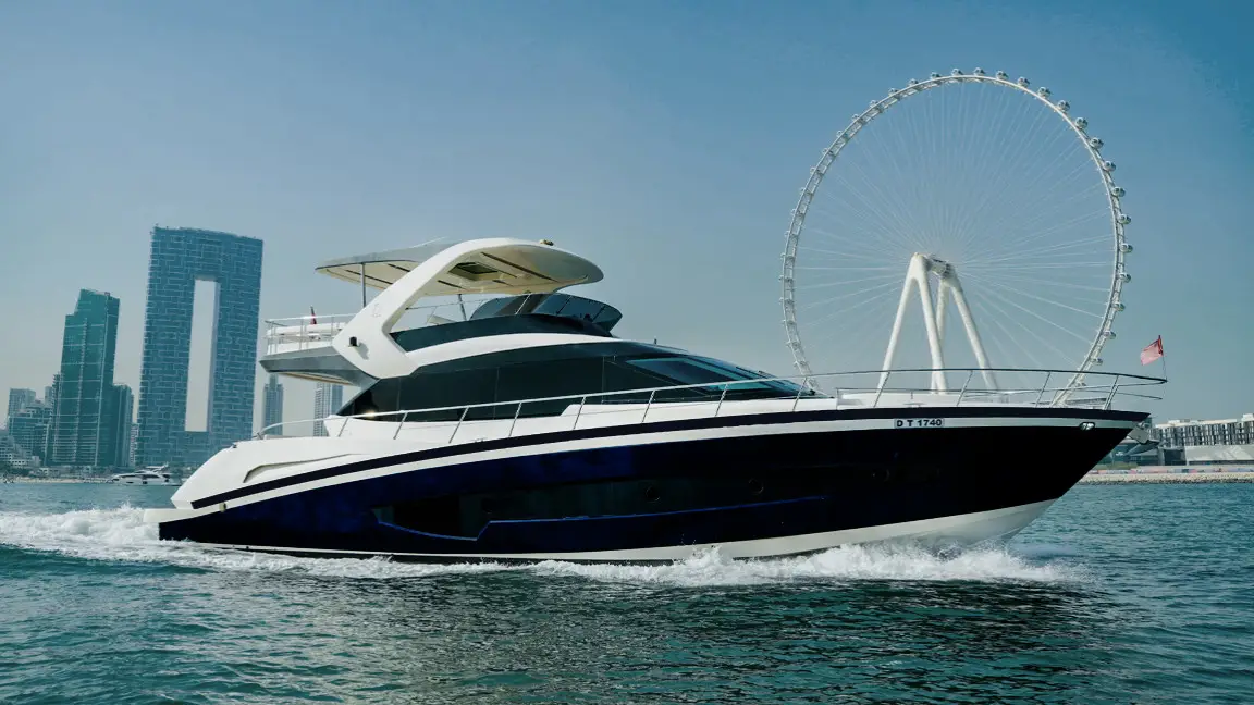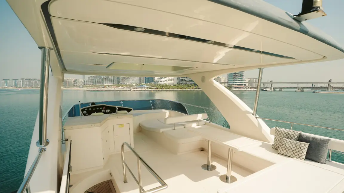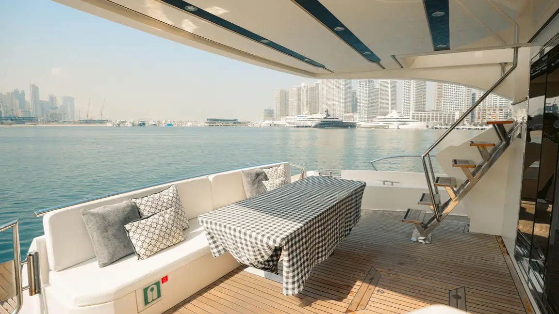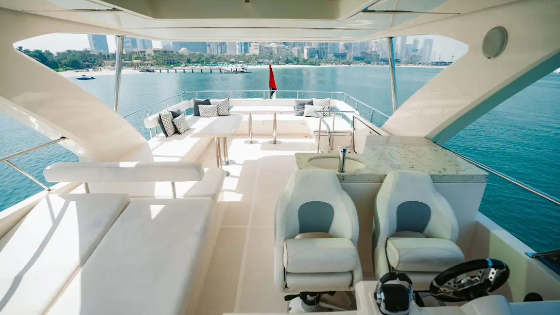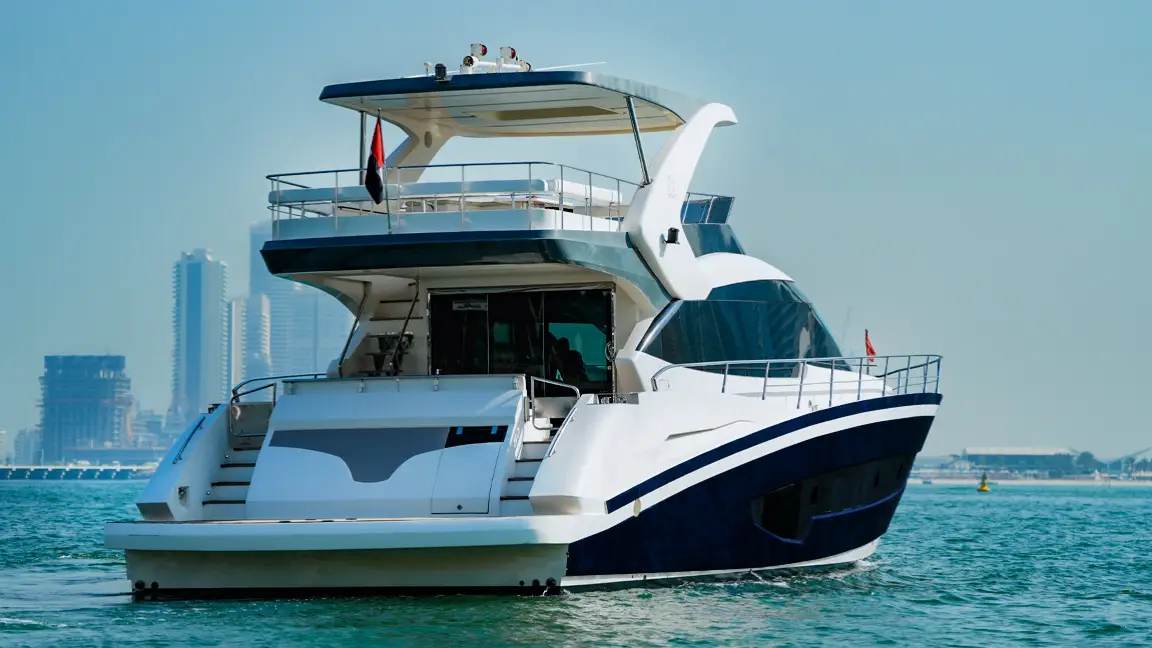 Book the brand new 75ft X41 yacht in Dubai, offering unique design and spacious luxury for up to 25 guests. Perfect for large groups seeking an exclusive sea experience with modern amenities and expert crew service.