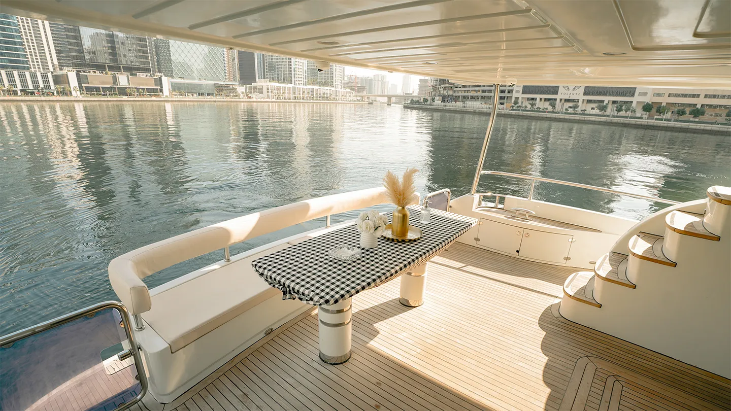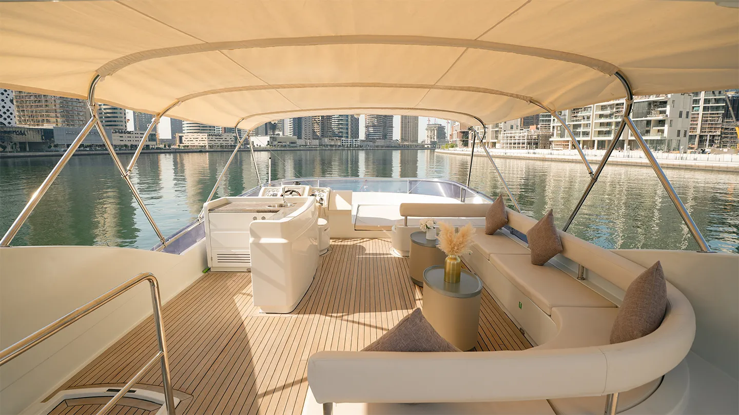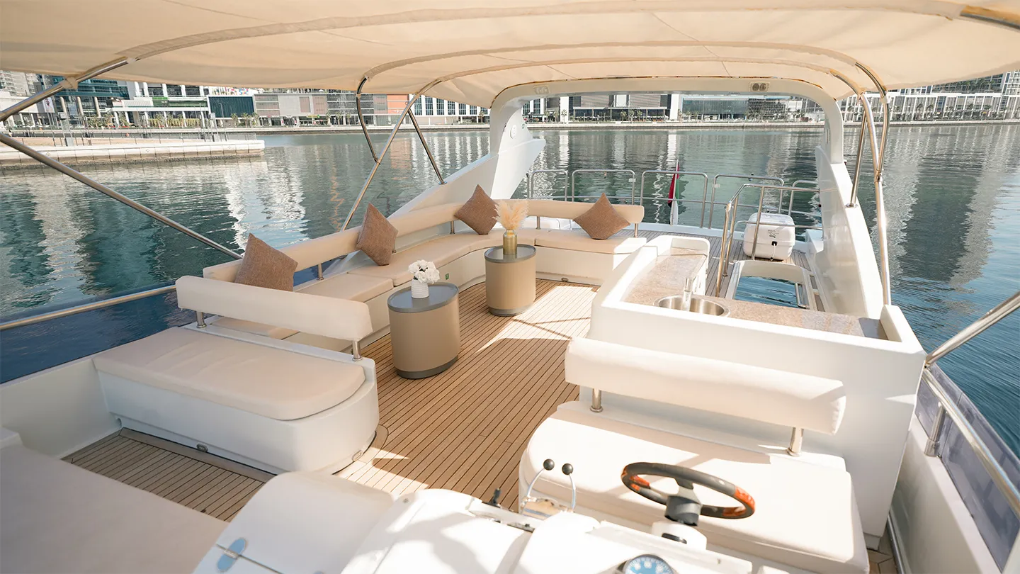 Xclusive 43 is a luxury yacht. She has a wide structure and a open plan top deck. perfect for large groups. Unique in design.